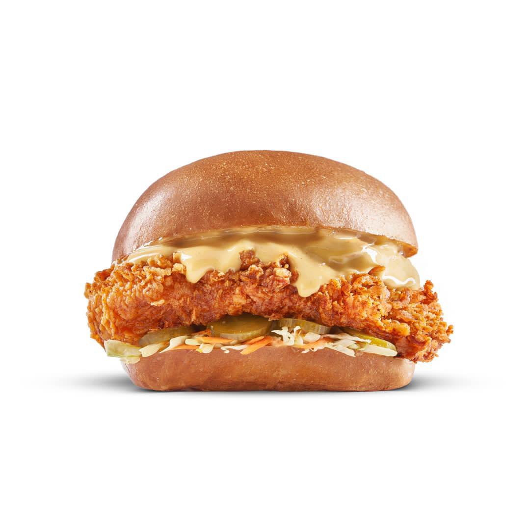 Brioche bun, Fried chicken breast, Cheese sauce, Pickles, Lettuce