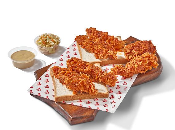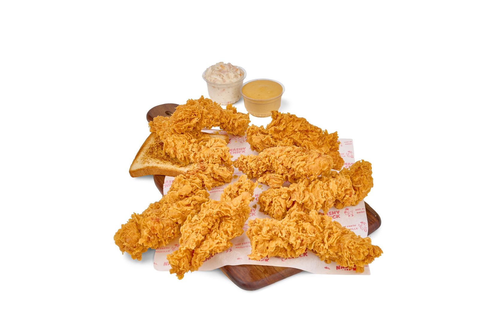 Brioche Toast, Fried Chicken Breast, Nashy Sauce, Pickles, and Dry Coleslaw