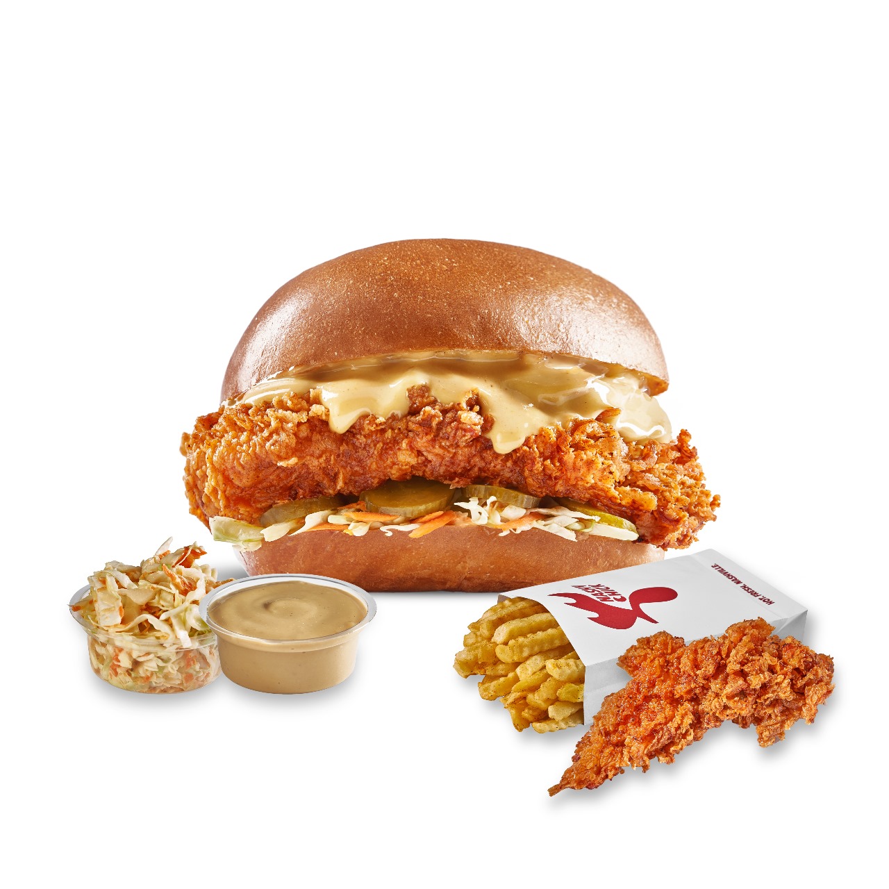 Brioche bun, Fried chicken breast, Nashy sauce, Pickles, Dry coleslaw